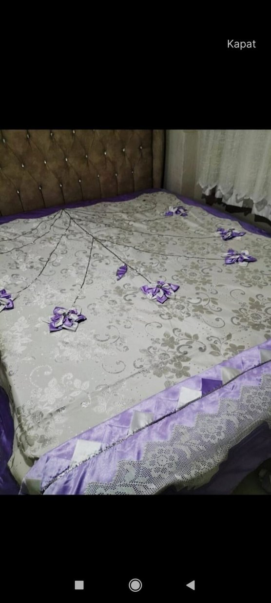 Gri yatak örtüsü, mor nakışlı detaylar ve dantel-saten dokulu süslemeler içerir. Yatak odasına zarif bir hava katar. ️