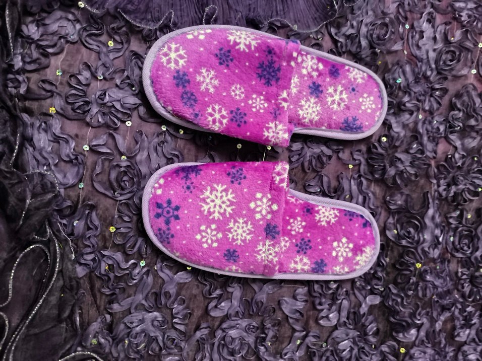 Mor renkte, nakışlı kar tanesi desenli ve yumuşak kürk detaylı kadın ev terliği, günlük kullanım için uygundur. ❄️