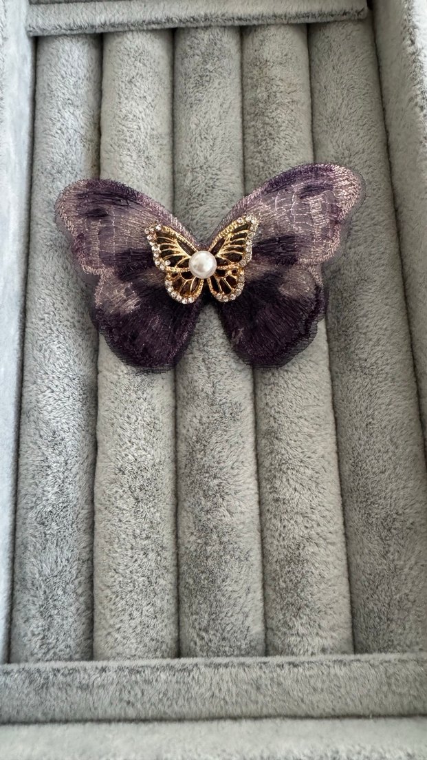 Mor nakışlı kelebek şeklinde broş, ortasında inci detaylı altın renkli fiyonk bulunur. Vintage ve bohem tarzlar için uygun.