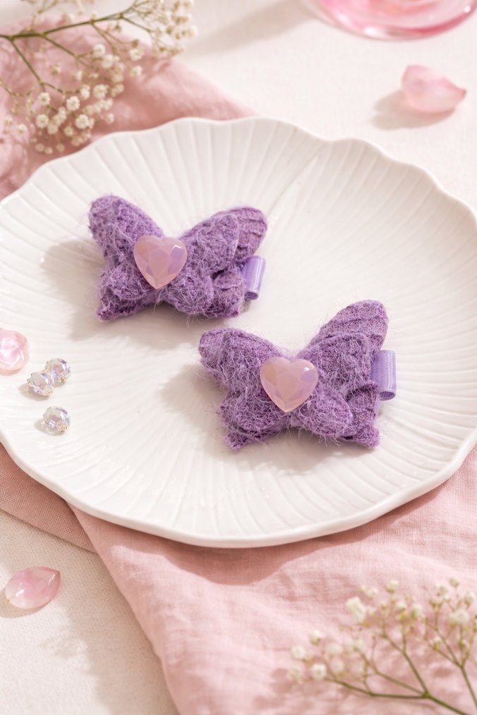 Mor nakışlı kelebek şeklinde çocuk saç tokaları, yumuşak kumaş fiyonk ve kalp şeklinde süs ile. Renkli, bohem tarzda şık detaylar sunar. Çift fiyatıdır renk için yazın