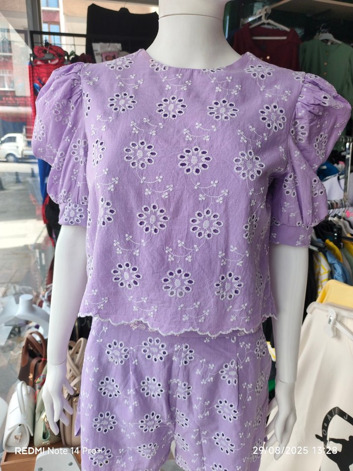 Mor pastel tonlarda, nakışlı çiçek desenli, dantelli, kısa kollu ve salaş kesim bluz. ve mini şort Yuvarlak yaka ve bohem tarzıyla uyumlu.