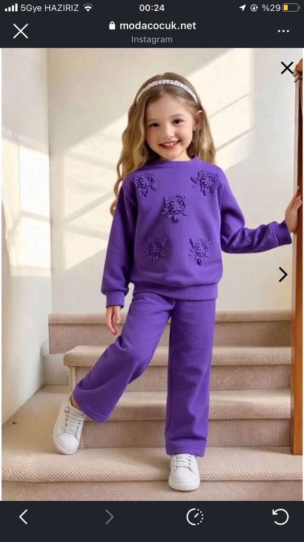 Mor renkli, nakış detaylı kız çocuk eşofman takımı, yumuşak ve sıcak kumaştan, bol kesim ve bisiklet yaka ile rahat bir tarz sunar.