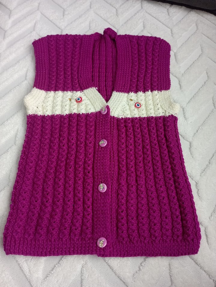 Mor renkli, nakış işlemeli kız çocuk örgü süveter. Düğmeli ve regular fit kesime sahip, yumuşak dokulu kolsuz tasarım.