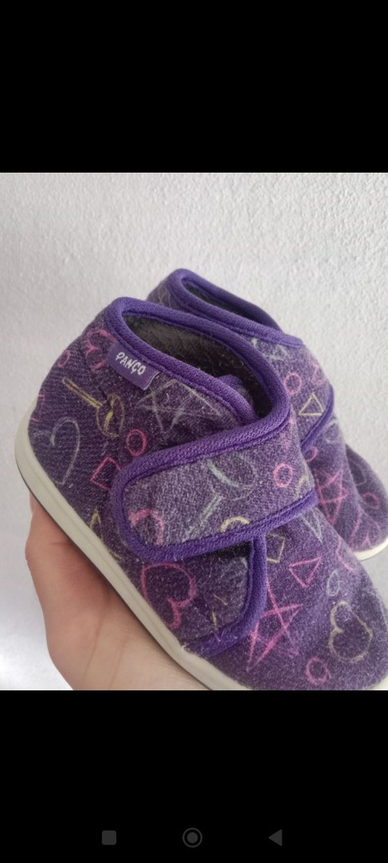 Mor polar kumaştan, renkli nakışlı desenlere ve cırt cırtlı bantlı kız çocuk terliği. PANCO markalı, sıcak ve şık sokak stili terlikler.