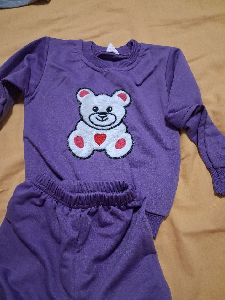 Mor renkli, bol kesim kız eşofman takımı; yuvarlak yaka ve uzun kollu. Üstte nakışlı renkli ayıcık deseni ve yumuşak, örme kumaş bulunur sıfırdır