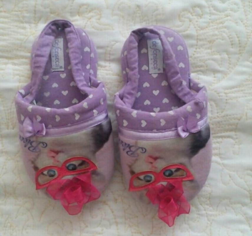 Mor, nakışlı ve dantelli kız ev terliği, renkli detaylara ve pop kültür tarzına sahip yumuşak kumaş.
