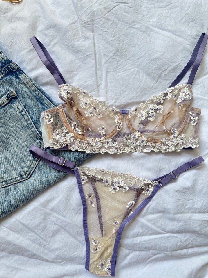 Pastel mor renkte, ince nakışlı, kısa boylu bohem sütyen takımı. Ayarlanabilir askılar ve şeffaf kumaşla zarif bir görünüm sunar. beden sorunuz.