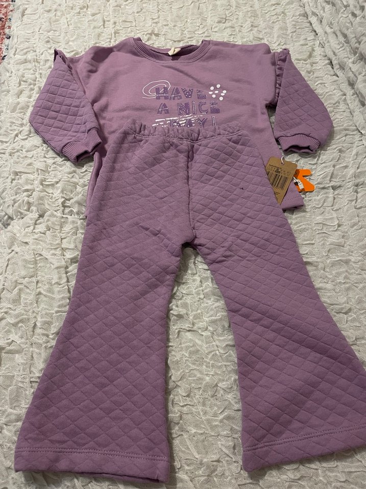 Uzun kollu, pastel mor renkte, nakış detaylı bebek kız takımı. Örgü, yumuşak ve kapitone dokulu kumaştan üretilmiştir 2 yaş içindir.