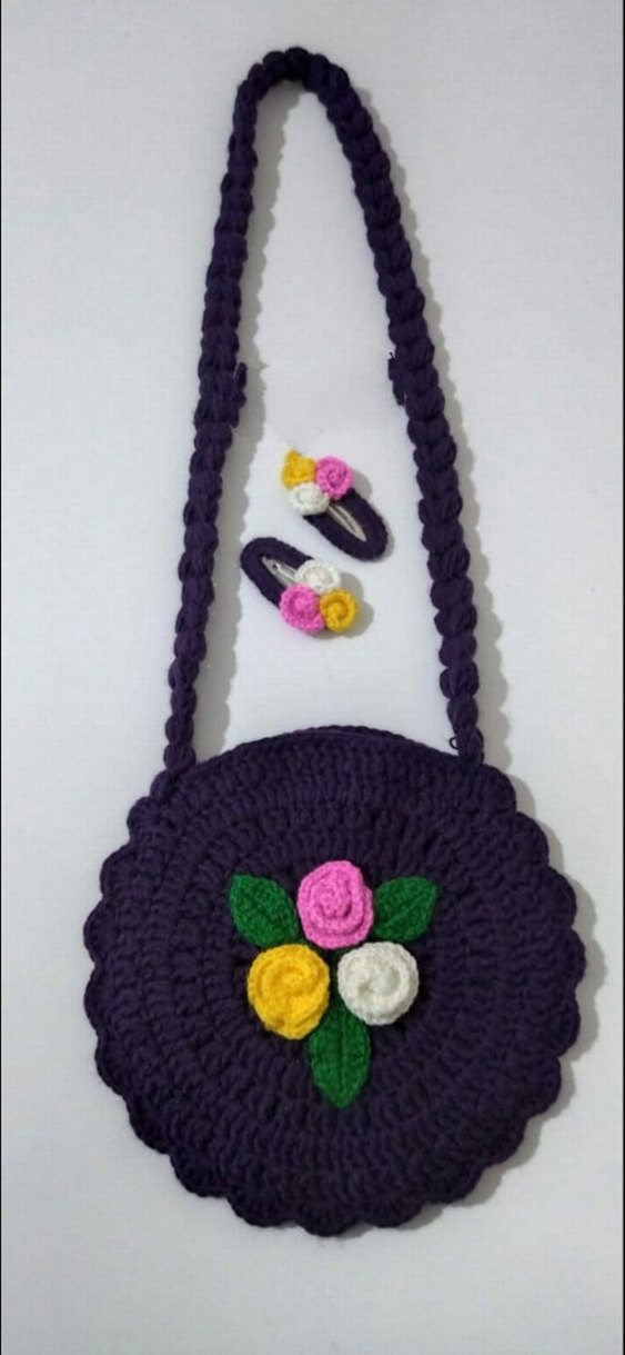 Mor örgü bohem tarzı çanta, renkli nakışlı çiçek desenleriyle ve uyumlu saç tokalarıyla birlikte.