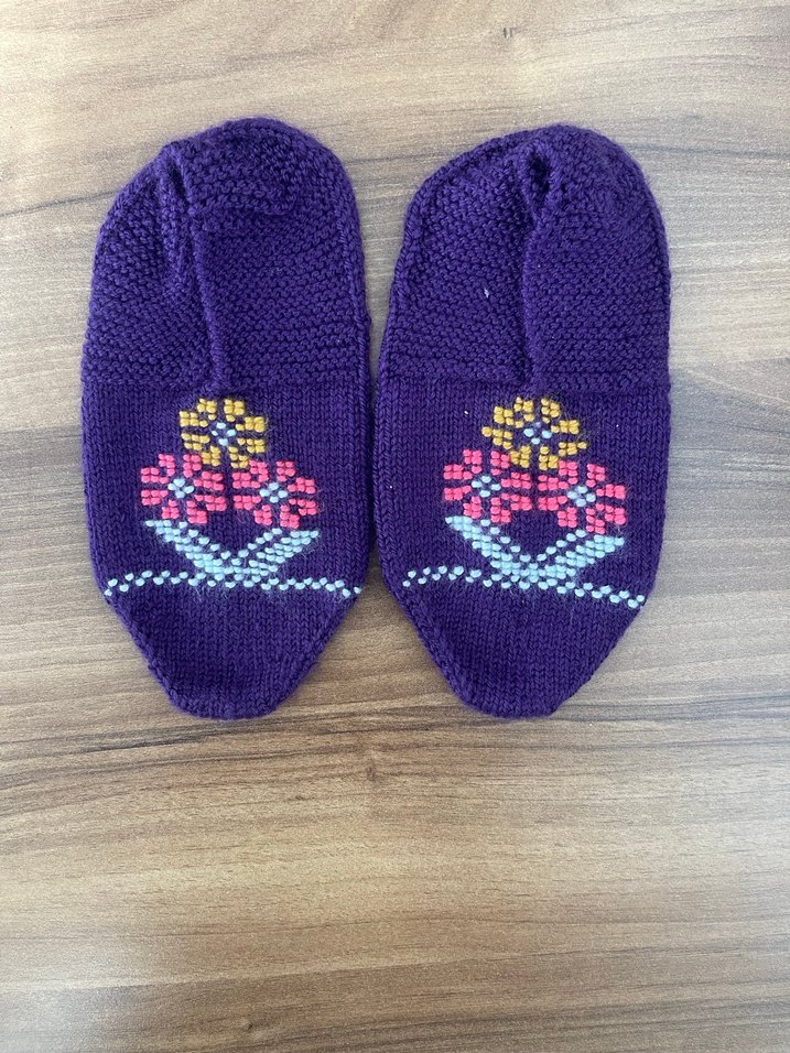 Mor renkli, nakışlı çiçek desenli örgü kadın ev patiği Rahat ve bohem tarzıyla günlük kullanıma uygundur. Beş şiş ile işlenmiştir