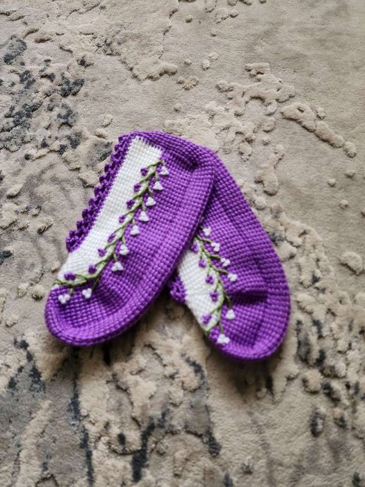 Mor renkli, nakışlı örgü kadın terlikleri. Rahat ve bohem tarzıyla günlük kullanıma uygun.
