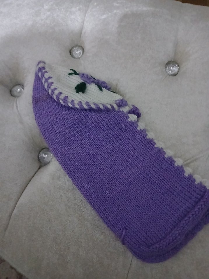 Mor ve gri tonlarında, nakışlı çiçek detaylı örgü kız ev terliği. Yumuşak örgü kumaş rahatlık ve sıcaklık sağlar.
