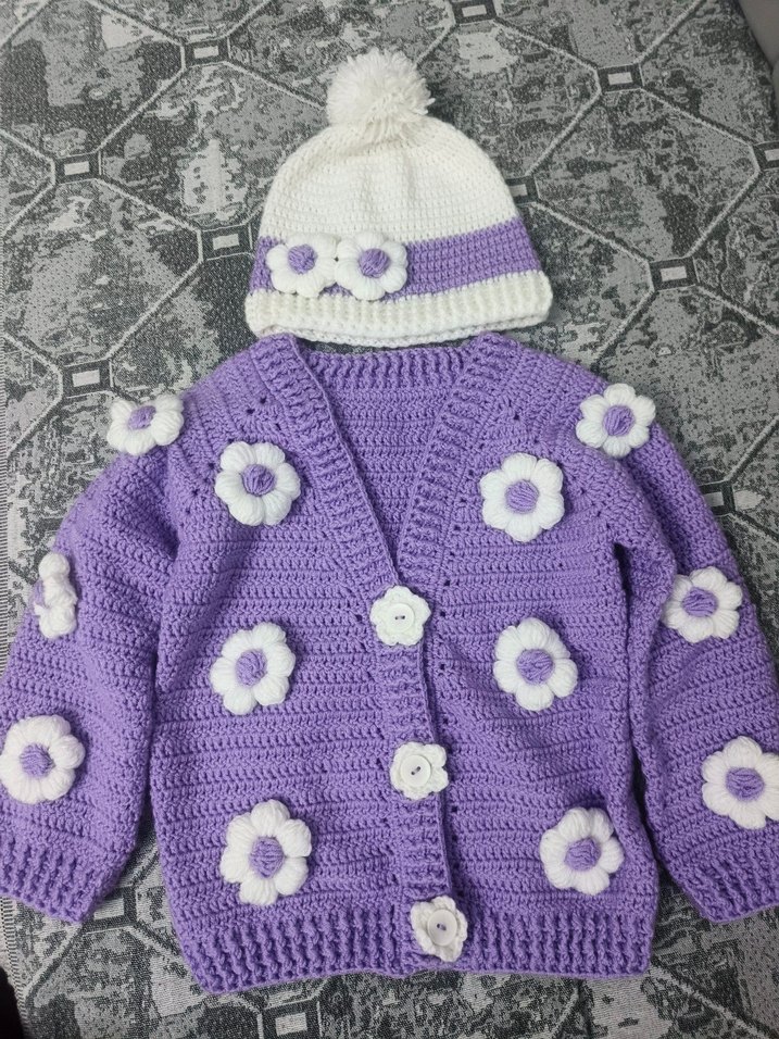 Pastel mor renkte, uzun kollu, beyaz nakışlı çiçek detaylı, bol kesim bohem tarzda örgü kız hırkası.