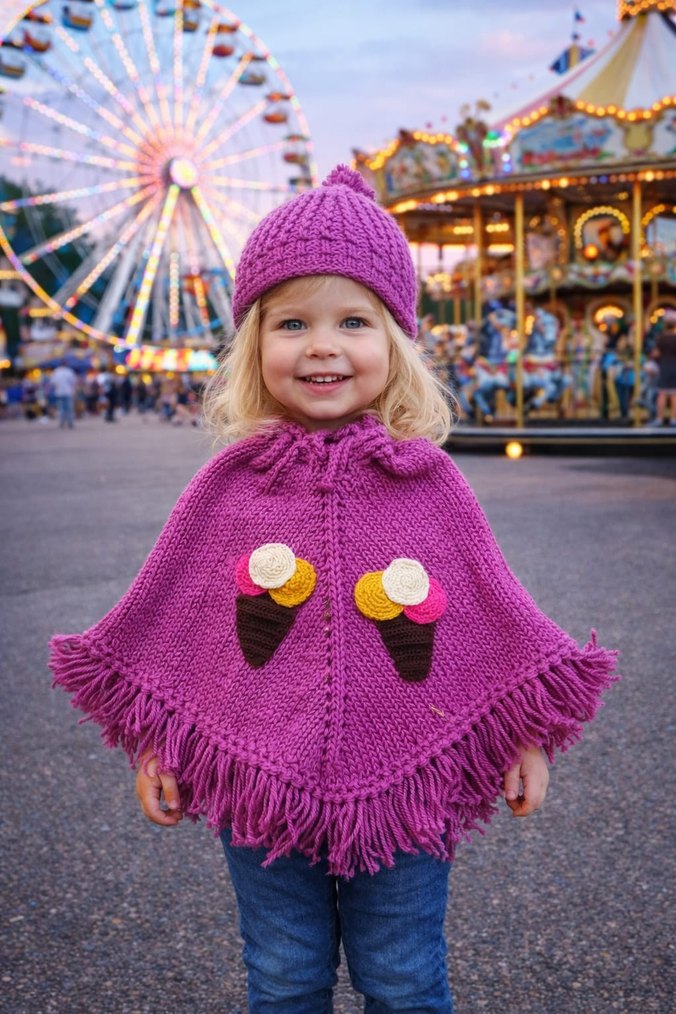 Renkli mor örgü panço, nakışlı dondurma desenleriyle, bol kesim, uzun kollu ve yuvarlak yakalıdır. Bohem ve retro tarzda, püskül detaylıdır.