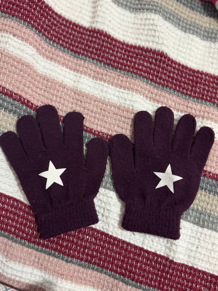 Yumuşak örme kumaştan yapılmış, mor renkli, renkli nakışlı yıldız detaylı kız eldiveni. 5-6 yaş
