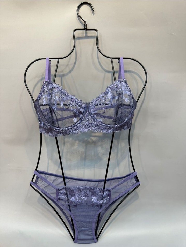 Bu çağdaş sütyen takımı, koyu mor nakışlarla midi uzunluğa ve Parisian tarzına sahiptir. İnce tül ve çiçek nakışları zarif bir görünüm sunar.