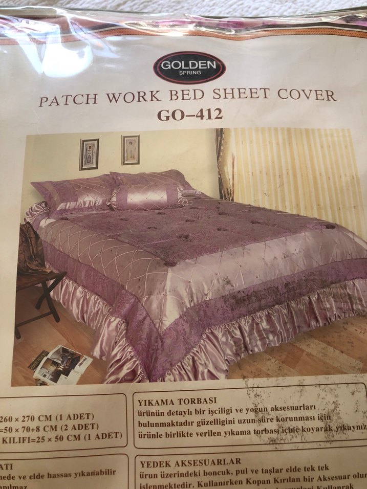 Mor renkli, parlak ve işlemeli yatak örtüsü. Üzerinde boncuk, pul ve taş detayları el işi ile işlenmiştir. Yıkama torbası ve yedek aksesuarlar dahildir. ✨