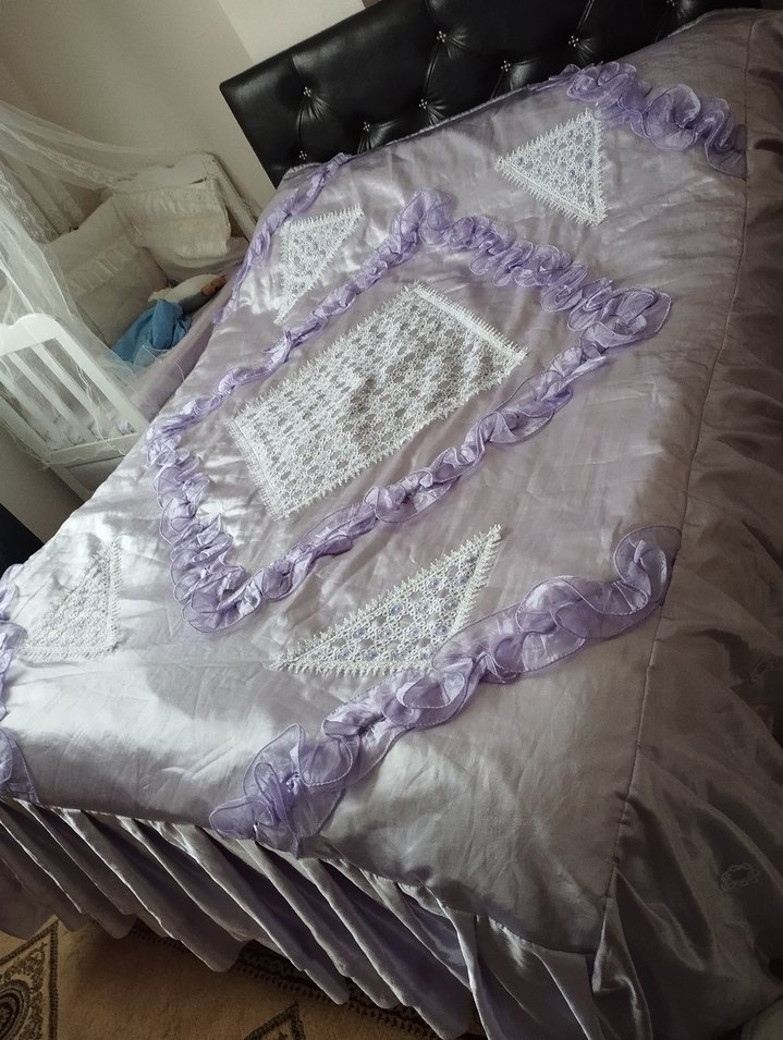 Parlak mor yatak örtüsü, beyaz nakışlı dantel detayları ve zarif fırfır kenarlarla süslenmiştir. ️