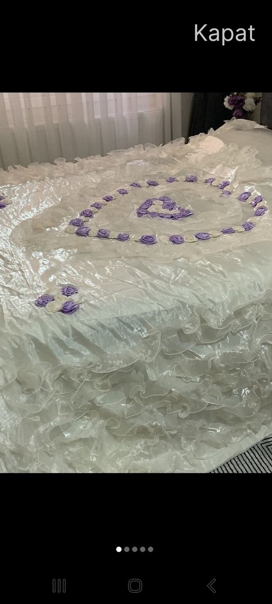 Pastel mor nakışlı kalp desenleriyle süslenmiş, yumuşak ve parlak kumaştan yapılmış şık yatak örtüsü. yastigi var 2 tane yastik yuzu cehizliktir duyun gunu kulanildi