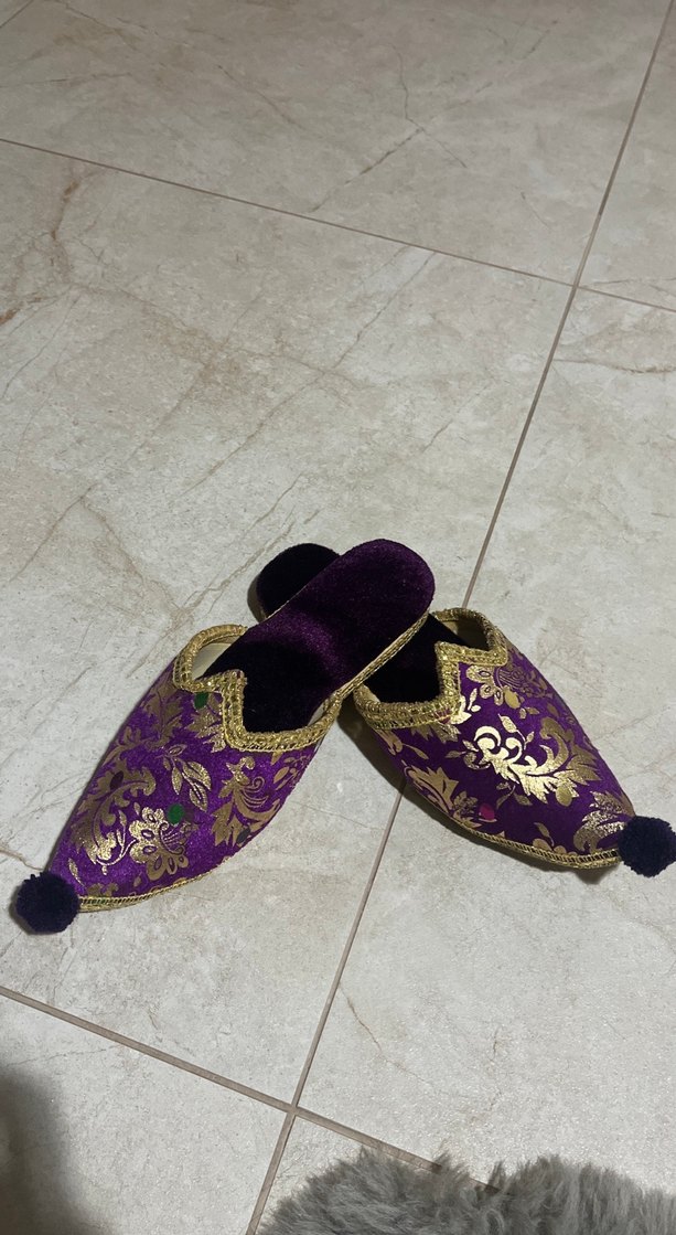 Mor renkli, nakışlı ve püsküllü kadın terlik. İpeksi dokusu ve ince topuklu tasarımıyla rahat ve retro bir görünüm sunar.