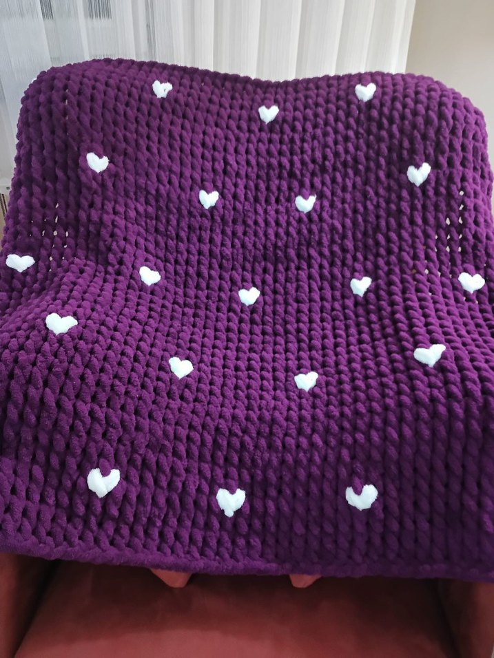 Mor zemin üzerine renkli işlemeli kalp desenleri bulunan, sıcak ve dekoratif bir battaniye.