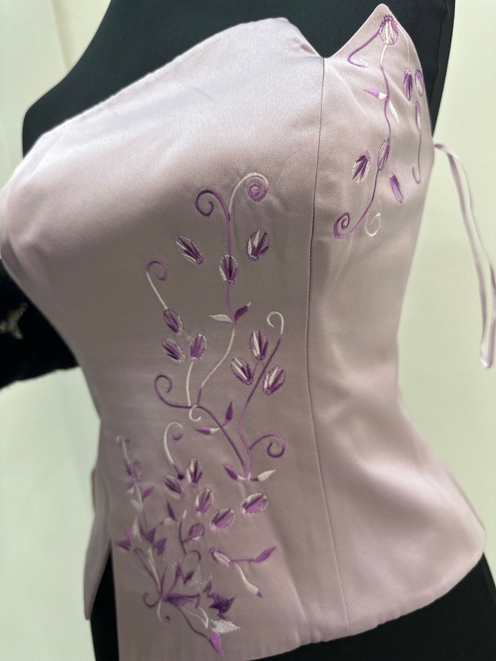 Fitted, straplez ve uzun kesimli bu mor bustiyer, ipeksi dokusu ve zarif nakış detaylarıyla avant-garde tarzını yansıtıyor.
