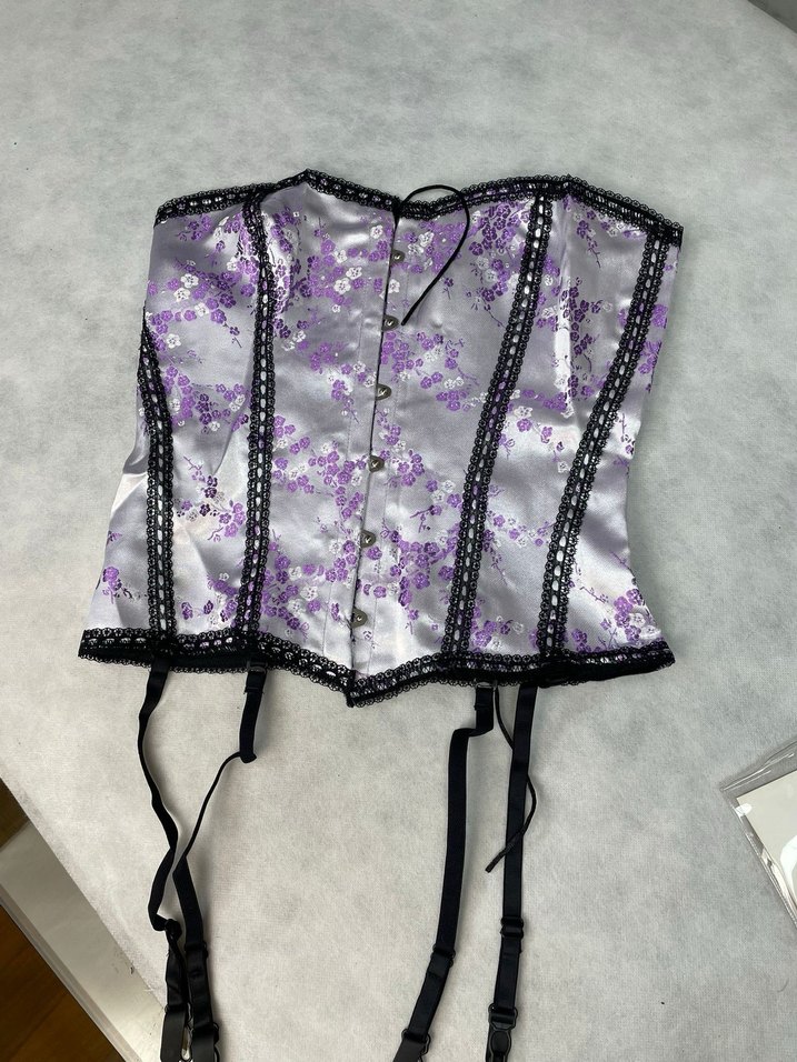Mor nakışlı çiçek desenli, siyah dantel detaylı straplez büstiyer. Vücuda oturan midi boy, şık gotik tarz için ideal. 3 parça gönderilir.Büstiyer-String-Çorap S/M beden uyumludur. Ürünün duruşu görsellerin sonundadır. Hijyen kuralları gereği iade yoktur.✨