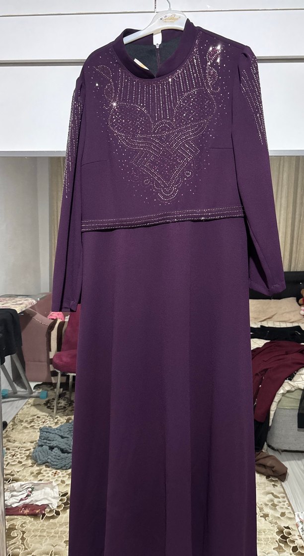 Mor renkte, nakışlı ve drapeli detaylara sahip uzun abiye elbise, yuvarlak yaka ve uzun kolludur. Düğünler için uygun, sade ve rahat kesimlidir. ✨
