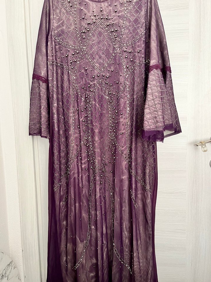 Mor renkte, nakışlı ve drapeli uzun tesettür abiye. Yalnızca 1 kez giyildi ağır işlemeli güzel bir abiye