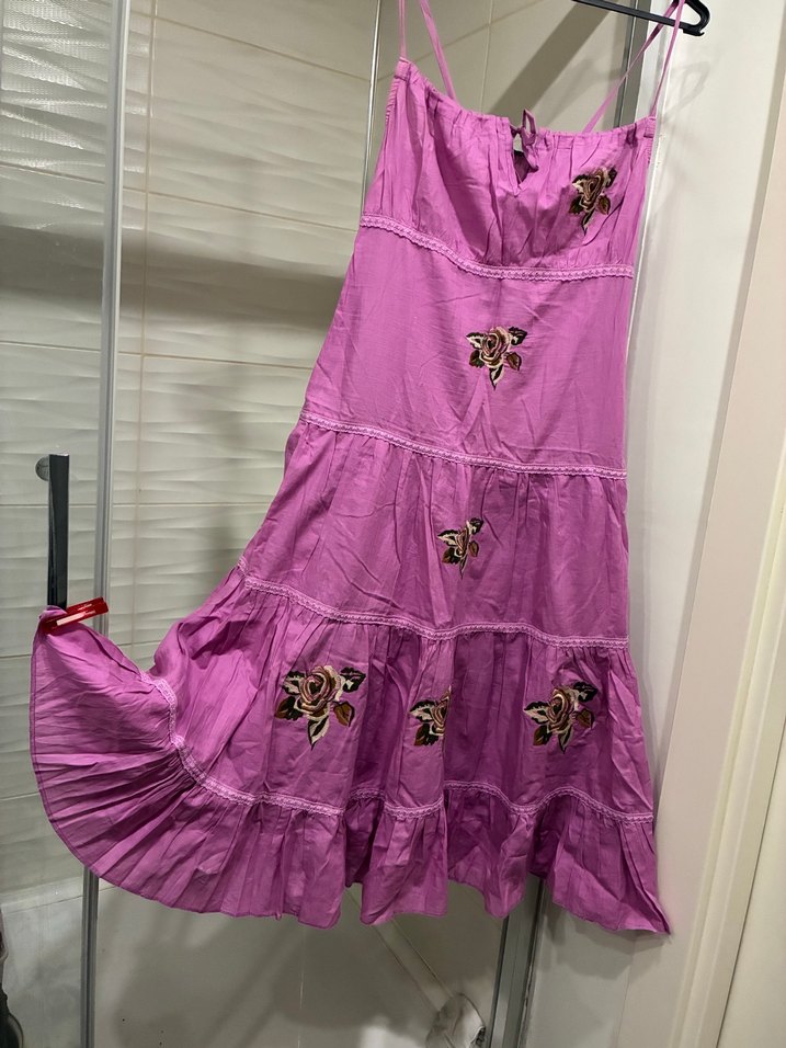 Mor renkte, nakış işlemeli, straplez ve ince askılı, bol kesim uzun bohem elbise. Kat kat fırfırlı tasarımıyla parti için uygun.