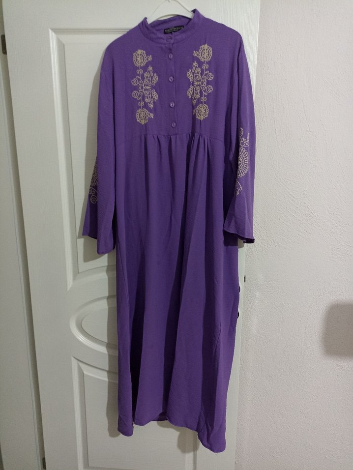 Mor renkli, yüksek yakalı ve uzun kollu aerobin kumaştan, nakış detaylı, bol kesim ve dökümlü bohem tarzda uzun elbise. hafif lekeleri var ama leke çıkarıcı ile çıkar 40 44 bedene uyumlu