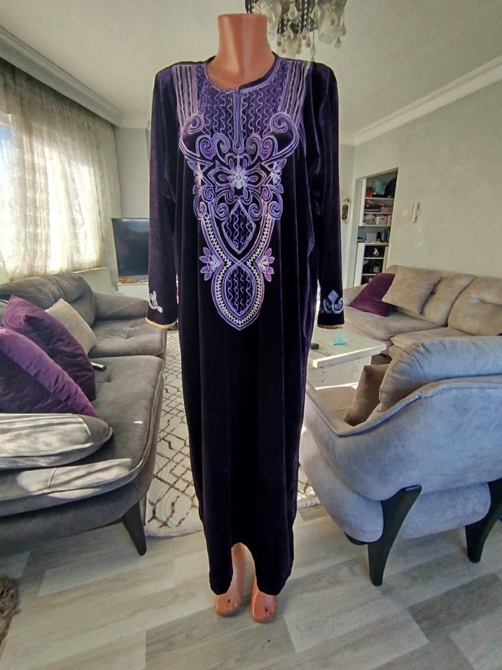 Mor renkli, uzun kollu, bol kesim ve drapeli bu uzun elbise, koyu tonlarda nakış detaylarına sahip. Sentetik kumaştan üretilmiştir ve günlük kullanıma uygundur.