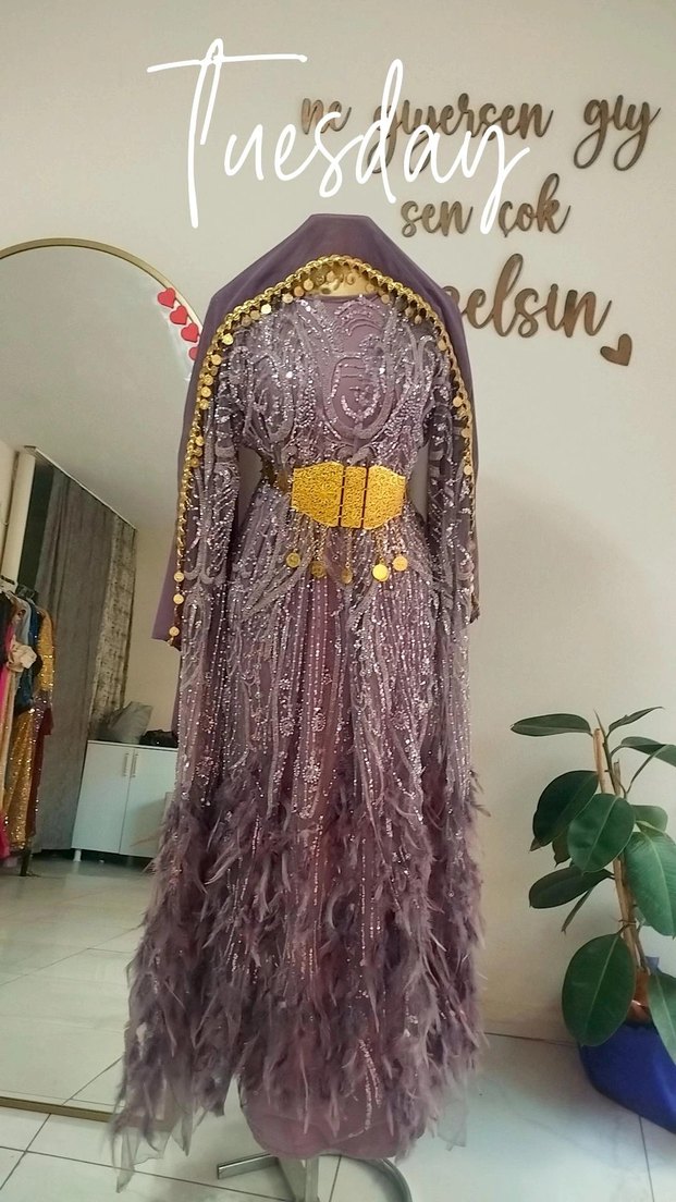Mor renkte, yüksek yakalı, askılı ve nakışlı detaylara sahip bohem tarzda uzun kına elbisesi. Drapeli kesimi ve düzenli kalıbıyla şık ve yenilikçi bir görünüm sunar. ✨