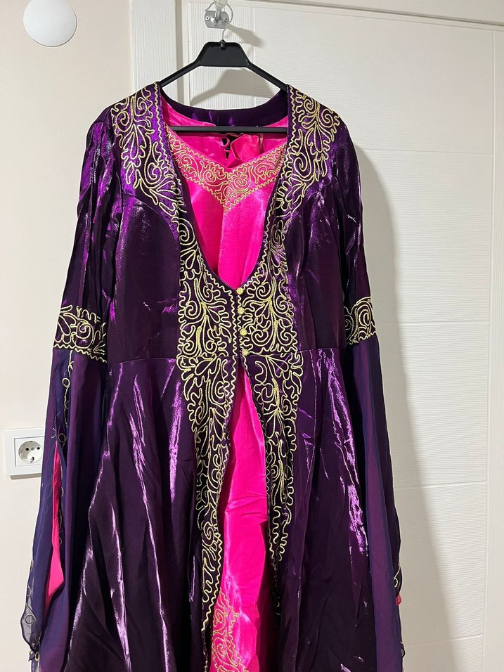 Nakış detaylı, dökümlü uzun kollu, V yakalı mor kına elbisesi. Salaş kesimi ve bohem tarzı ile sizin için uygun