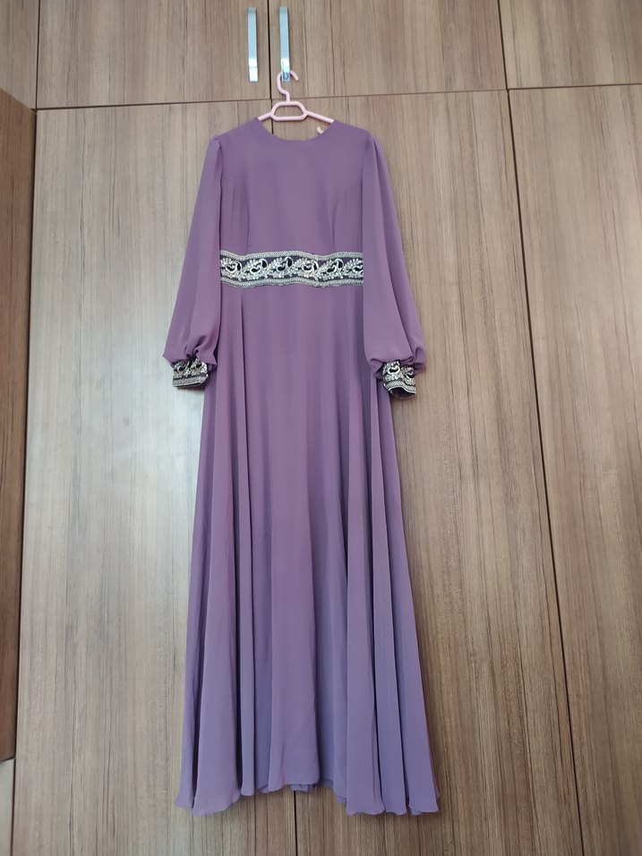 Pastel mor renkli, bol kesim, drapeli uzun kollu elbise. Bel ve manşetlerde nakış detayları bulunur. Yuvarlak yaka, tesettür tarzına uygundur, düğün için ideal. şalı ile beraber saldaki defo goruntude 38 40 beden olur