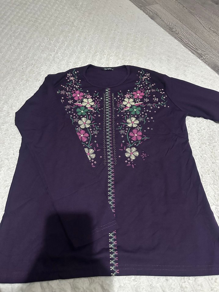 Mor renkli, uzun kollu kadın bluz, boncuklu nakış desenleri ile süslenmiş, bol kesim ve yuvarlak yakalıdır. Bohem tarzına uygundur.