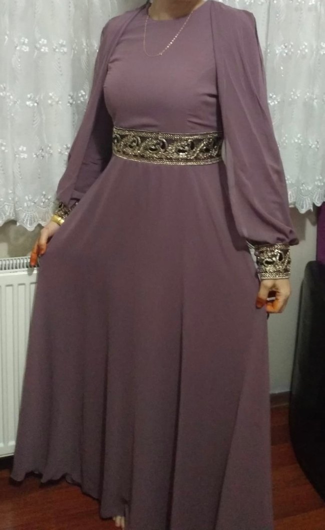 Koyu mor renkli, uzun kollu, tekne yaka kadın abiye elbisesi. Nakışlı manşetler ve bel detayıyla drapeli ve bol kesimdir. Düğün için uygundur.