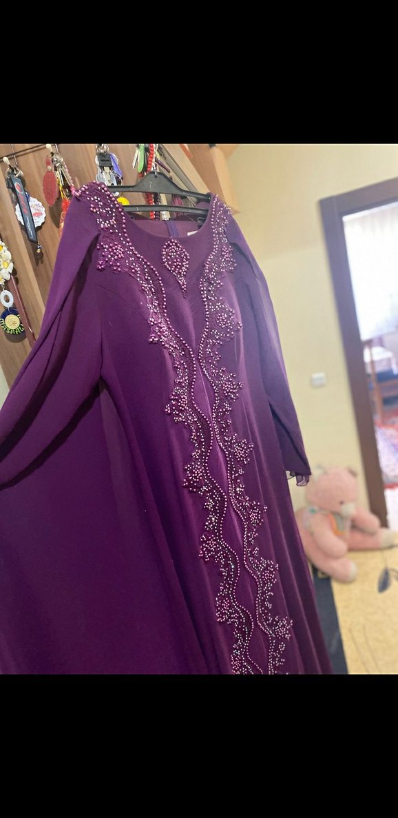 Bol kesim, uzun kollu, V yaka kadın elbisesi. Nakışlı ve drapeli tasarımıyla parlak mor renkte, modest ve bohem tarzda, düğünler için uygun. indirim yapılır.