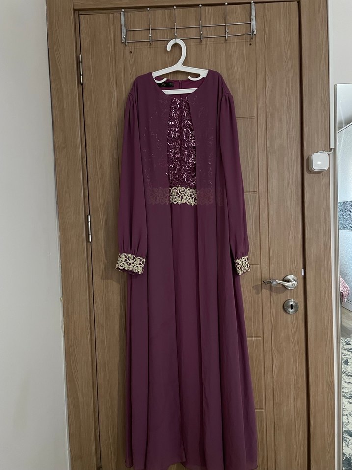 Mor renkte, uzun kollu, yüksek yakalı ve salaş kesim uzun elbise. Önde, bel ve manşetlerde nakış detayları bulunur. Düğün için uygun.