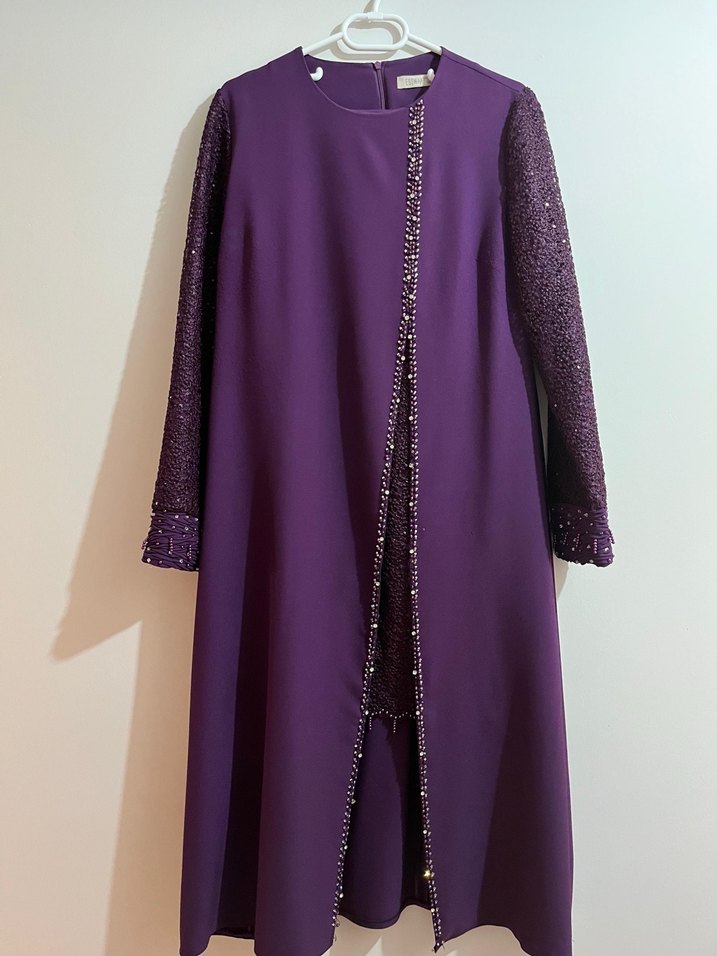 Mor renkte, nakış işlemeli uzun kollu, drapeli detaylara sahip uzun tunik Sentetik kumaştan, modern klasik tarzda.