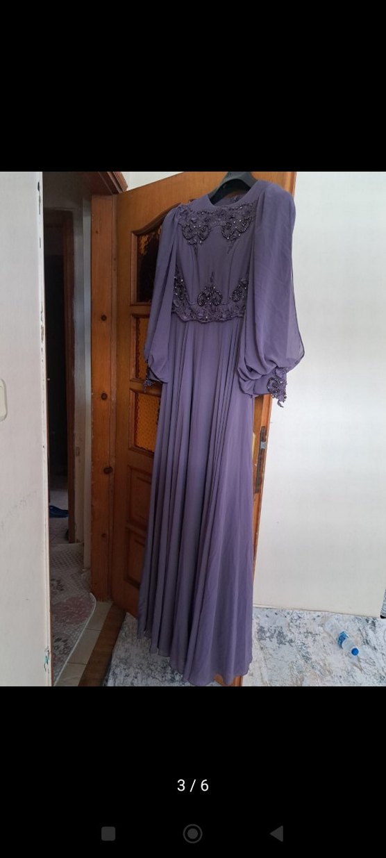 Mor renkte, yüksek yakalı, uzun kollu ve nakış detaylı uzun elbise. Salaş kesimi ve vintage klasik tarzıyla düğünler için uygundur.