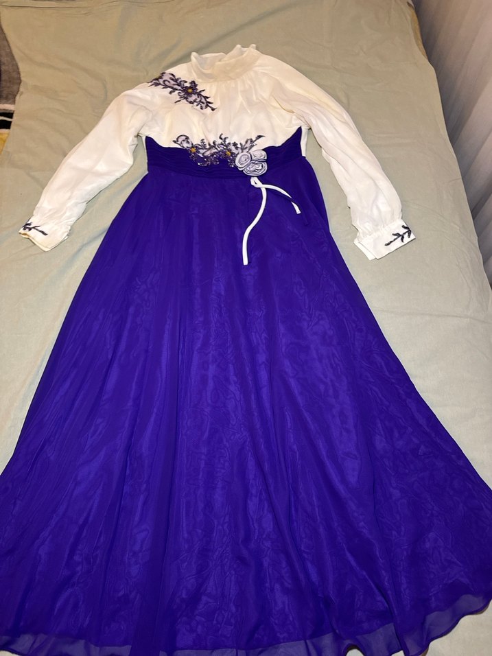 Uzun kollu, bol kesim mor elbise, nakış detaylıdır. Vintage şık ve rahat bir tasarıma sahiptir. Uygun 2 eşarpla birlikte gönderilecektir 46 beden fakat kalıp dar olduğu için 44 bedene uygundur