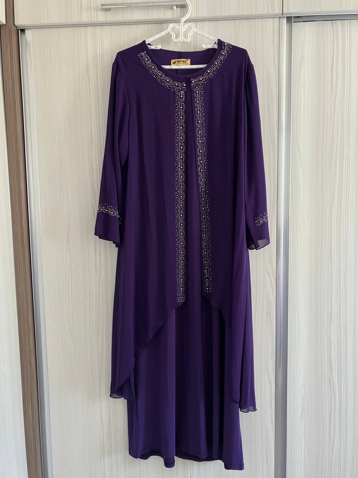 Mor renkte, nakış detaylı, uzun kollu ve salaş kesim kadın elbisesi. İpek gibi kumaştan, düğünler için uygun, asimetrik drapeli tasarım.Az kullanılmış tesettür büyük beden kadın gece elbisesi