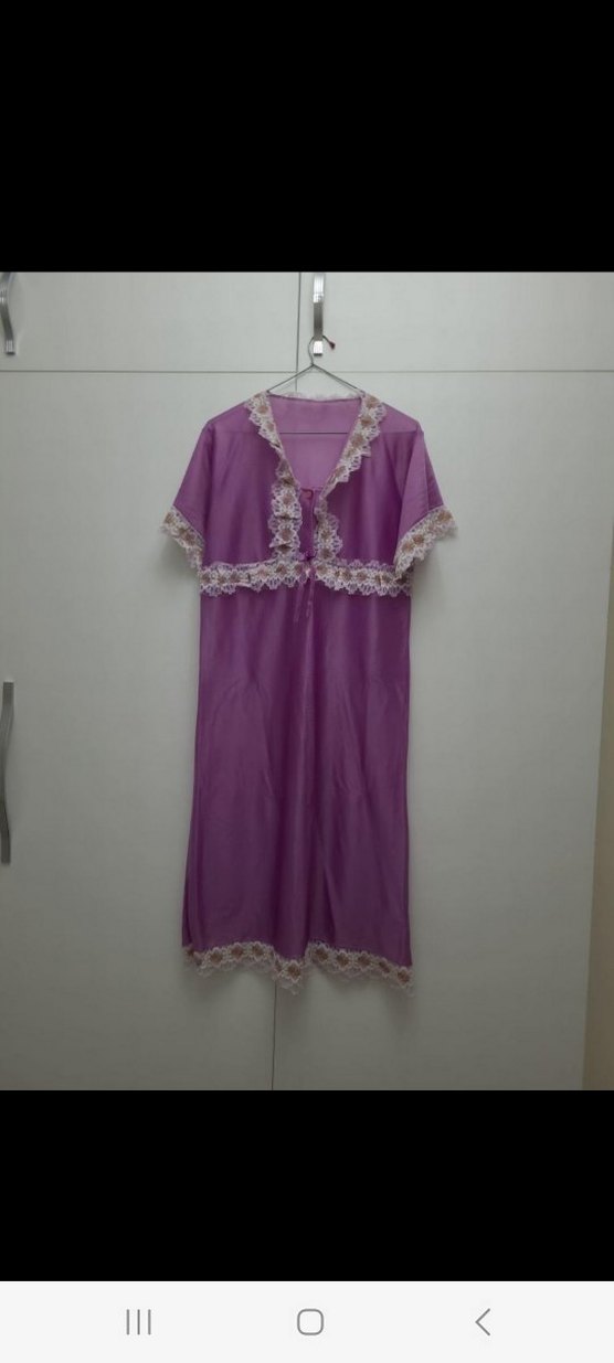 Mor renkli, nakışlı dantelli süslemelere sahip, bol kesim ve kolsuz uzun kadın geceliği. 36 38 beden uyumlu naif bir gecelik.