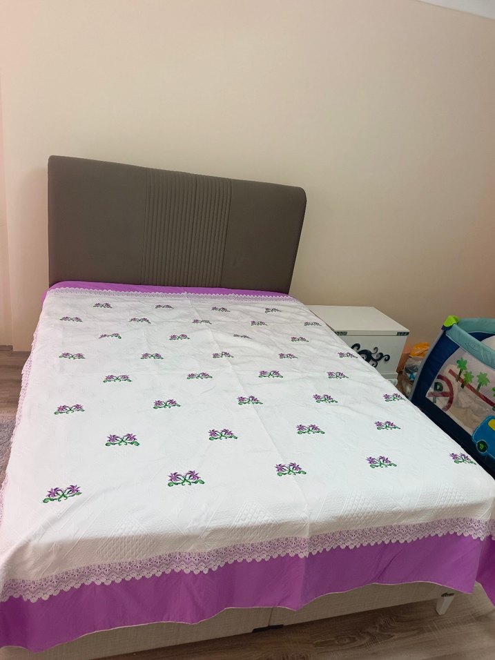 Çok az kullandım. Ağır bir örtü. Mor tonlarında çiçek nakışları var. Annemin çeyizinden işlemeleri alıp benim çeyizimde kullanmıştık. Herhangi bir leke yok. Tertemiz bir örtü. Sadece bir ucundaki kumaşta 5-6 cm'lik ip çekilmiş. O da neredeyse hiç belli değil. Odaklayarak çekip son fotoda göstermeye çalıştım.