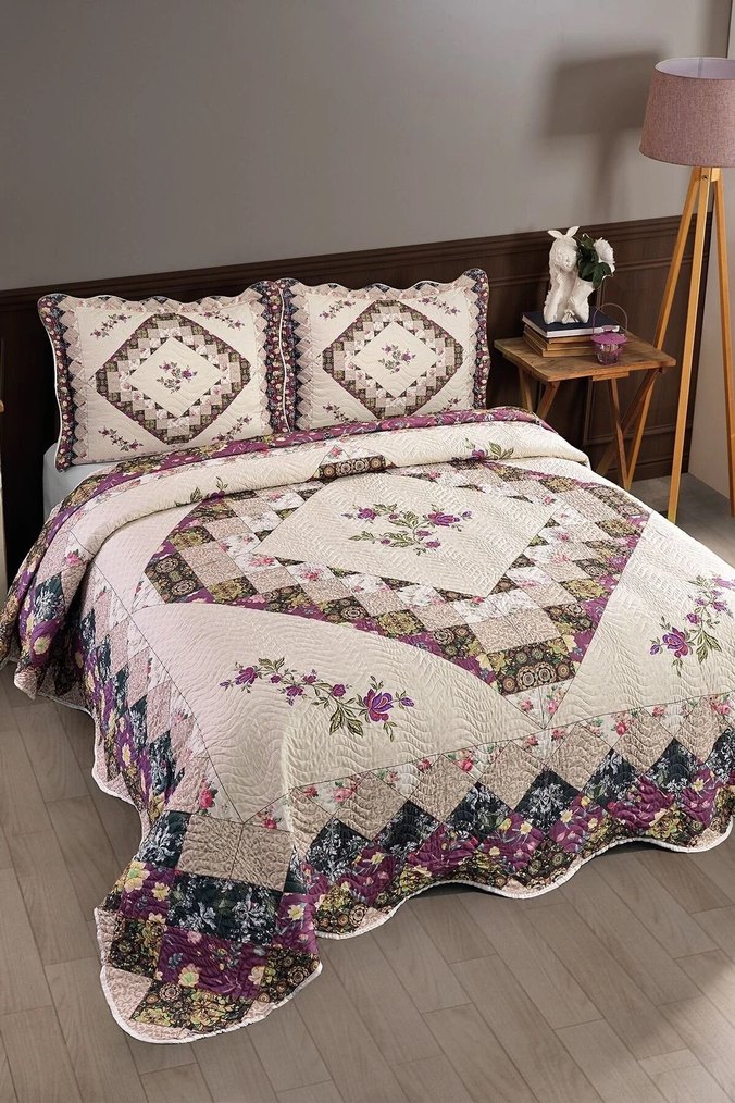 Koyu mor renkli, nakışlı çiçek desenleri ve patchwork detaylı yatak örtüsü. Kenarları dalgalı, uyumlu yastık kılıflarıyla beraber.