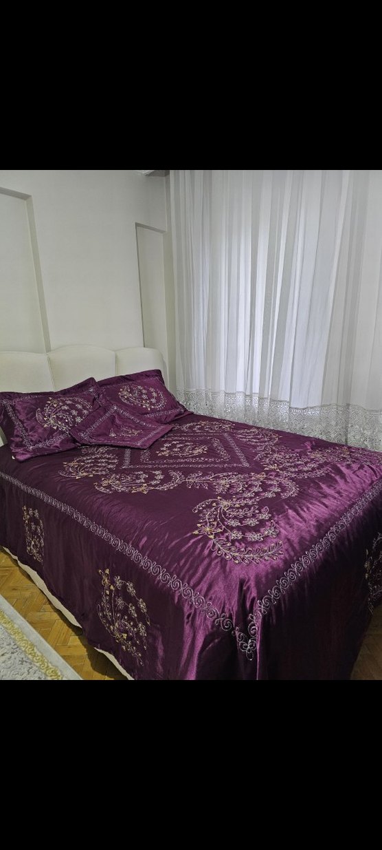 Koyu mor renkte, zarif nakış desenlerine sahip yatak örtüsü. Uyumlu yastık kılıfları ile birlikte sunulur. ️