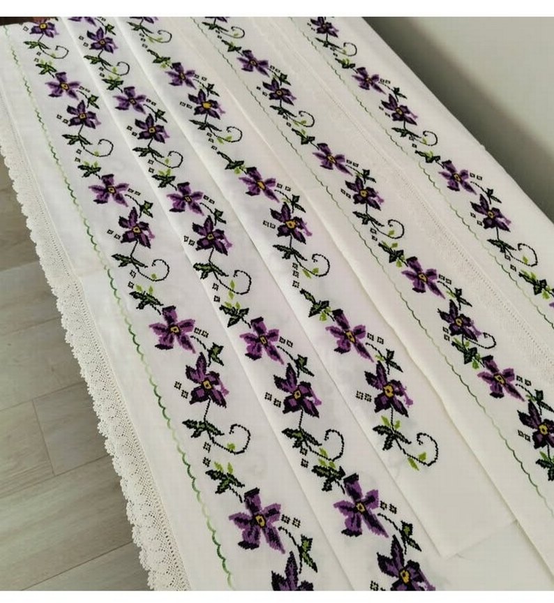 Klasik tarzda, beyaz zeminde koyu mor nakışlı çiçek desenlerine sahip , ince dantel kenarlarla tamamlanmıştır. ıkı etek bır uzun ıkı küstüm yastık