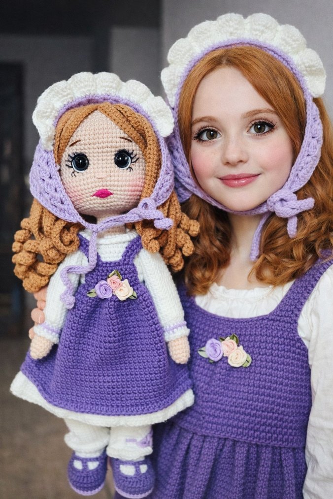 Pastel mor örgü elbiseli, çiçek detaylı bebek ve aynı renkte elbise ile başlık takan amigurumi kız çocuğu seti.Yaklasık 35 cm uzunluğunda örülmüş hazır üründür, özel sipariş için iletişim kurabilirsiniz.