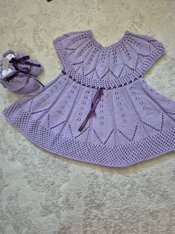 Pastel mor renkte, askılı örgü bebek kız elbise takımı ve uyumlu patikler. Elbise detaylı örgü ve ince kurdele kemer içerir. temiz kullanılmış 2 3 yaşa uygun